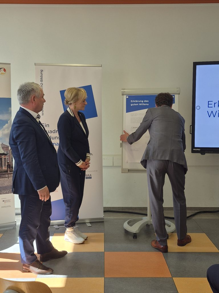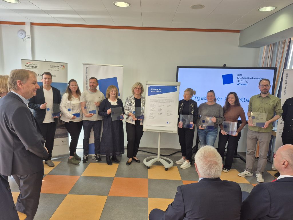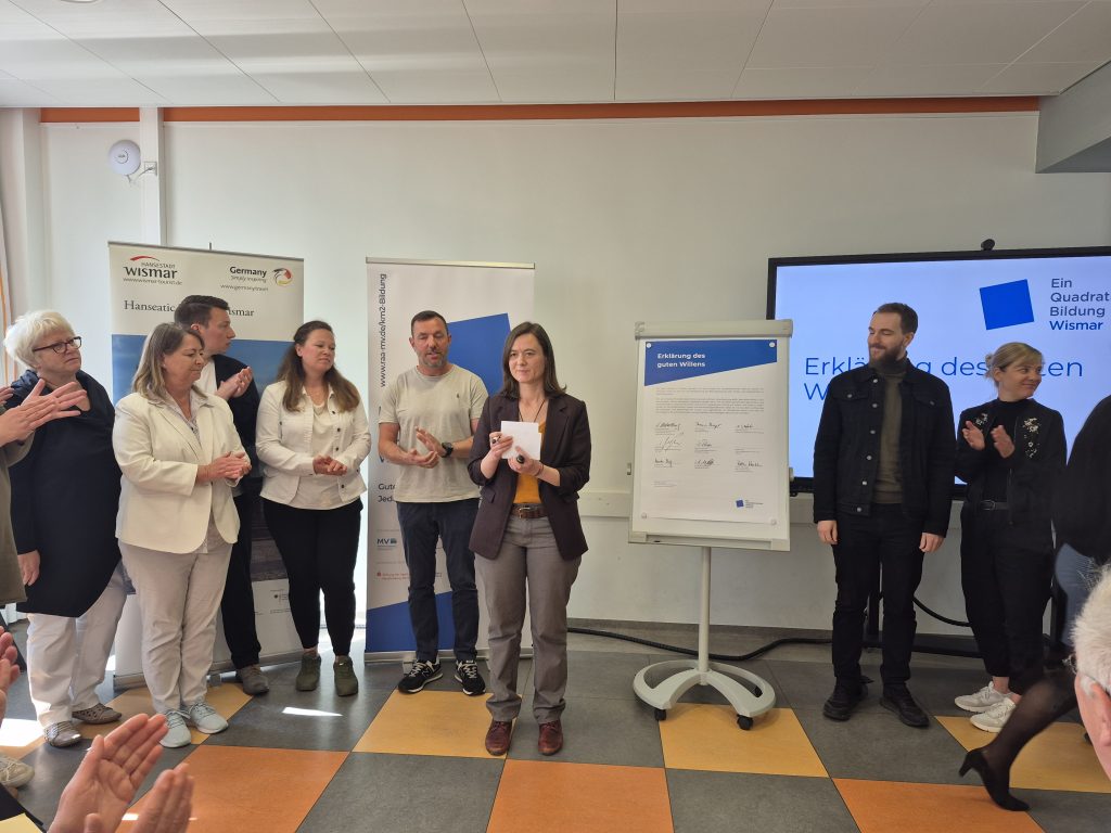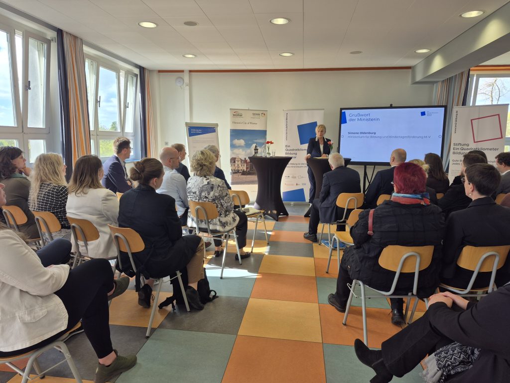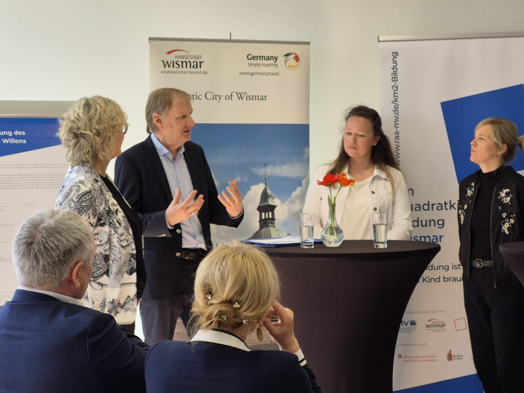 Mit einer gemeinsamen Auftaktveranstaltung und in Anwesenheit von Bildungsministerin Simone Oldenburg startete das Projekt „Ein Quadratkilometer Bildung Wismar“ am 27.04.2026 erfolgreich. Vertreterinnen und Vertreter von Land und Stadt sowie die Mitglieder des neuen Bildungsverbunds feierten gemeinsam mit der RAA M-V und der Stiftung Ein Quadratkilometer Bildung den Projektstart in der Seeblick-Grundschule im Wismarer Stadtteil Wendorf.