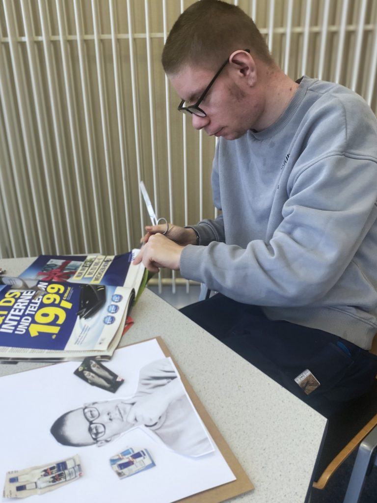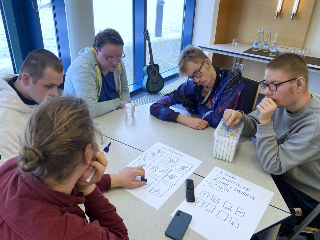 Vier Tage lang arbeiteten die Teilnehmenden in einer kreativen Medienwerkstatt, in der sie verschiedene Ausdrucksformen kennenlernten und darüber hinaus nutzten, um ihre Visionen zu gestalten. Sie führten eine Umfrage zu Zukunftserwartungen durch und erprobten Interviewtechniken. Dabei hielten sie neben den eigenen Vorstellungen und Wünsche auch die von Mitarbeiter*innen der Einrichtung fest. In einem Foto-Shooting inszenierten sie sich in Selbstporträts, die sie mit weiterem Bildmaterial aus Zeitschriften und Magazinen zu Collagen verarbeiteten, die ihre persönlichen Ziele und Pläne sichtbar machten. Mit der Legetricktechnik verwandelten sie die Zukunfts-Collagen in kurze Filmclips, die sie mit eigenen Audiokommentaren unterlegten. Mit „Was wäre, wenn“-Fragen spekulierten sie über fiktive Zukunftsszenarien und entwickelten daraus Ideen für Kurzfilme, die sie gemeinsam realisierten. Den gesamten Prozess – von der Ideenfindung und Storyboard-Entwicklung über die Rollenverteilung und Dreharbeiten bis zur Postproduktion – gestalteten sie im Team.