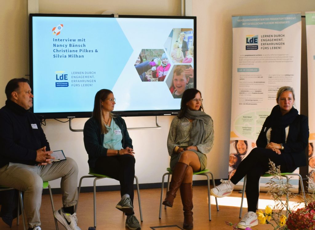 Los ging es mit einem Rundgang durch den RecknitzCampus, inklusive Einblick in die Unterrichtspraxis von Englischlehrerin Nancy Bänsch. Ihre 4. Klasse wertete den Besuch des Sommerfestes des DRK-Pflegeheims in Laage aus. Seit vorigem Schuljahr engagieren sich die Kinder im LdE-Unterrichtsprojekt „Generationslernen in Laage“, bei dem sie die Seniorinnen und Senioren im Pflegeheim regelmäßig treffen. Im Gespräch mit Nancy Bänsch, Lehrerin Silvia Milhan und Schulleiterin Christiane Pilkes wurde deutlich, wie die LdE-Projekte den Unterricht im RecknitzCampus bereichern. „LdE schafft Momente für bildungsbenachteiligte Kinder, die sonst nicht mit ihren Talenten sichtbar sind“, betonte zum Beispiel Christiane Pilkens. Wenn Lehrkräfte den Kindern zutrauen, den Unterrichtsverlauf mitzugestalten, biete der LdE-Unterricht außerdem eine Entlastung für die Lehrpersonen. Deshalb möchte man in Laage den Unterricht mit LdE ausweiten und das Kollegium dafür kontinuierlich qualifizieren – zum Beispiel im Rahmen des Zertifikatskurses des LdE-Kompetenzzentrums.