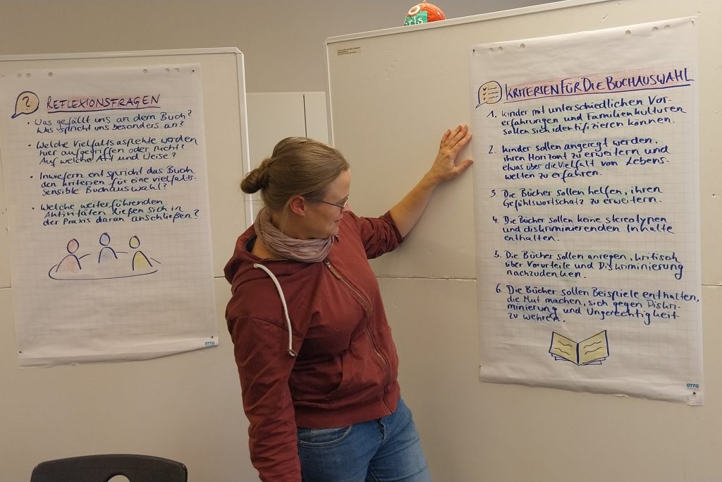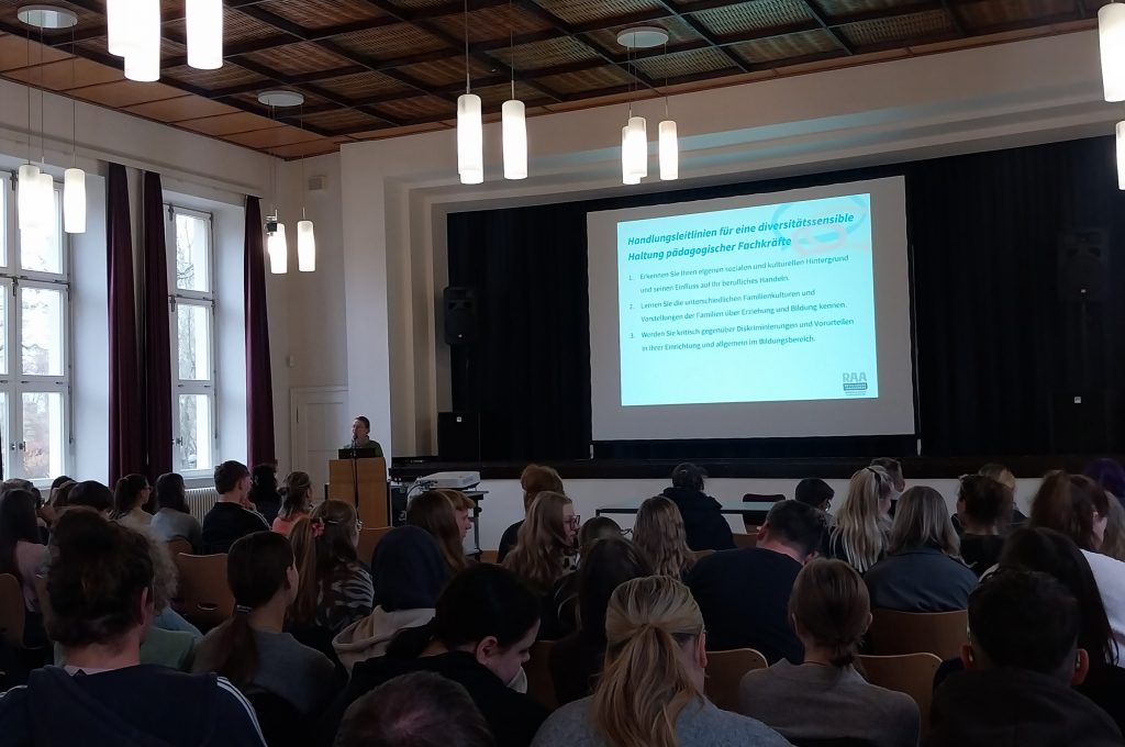 Im Rahmen der Anti-Gewalt-Wochen rund um den internationalen Tag gegen Gewalt an Frauen veranstaltete die AWO Familienbildung Güstrow gemeinsam mit dem RBB des Landkreises Rostock den Aktionstag „Diversitätssensible Handlungsalternativen im pädagogischen Alltag“ am 19.11. für rund 100 Berufsschüler*innen der erzieherischen Ausbildungsgänge. Auch hier hielt Dr. Claudia Seele von der Fachstelle Mehrsprachigkeit MV einen Eröffnungsvortrag, diesmal unter dem Titel „Diversität – eine Frage der Haltung“. Ein Workshop zum Thema „Vielfalt im Kinderbuch“ rundete das Thema mit praktischen Anregungen für diversitätssensible Vorleseangebote ab.