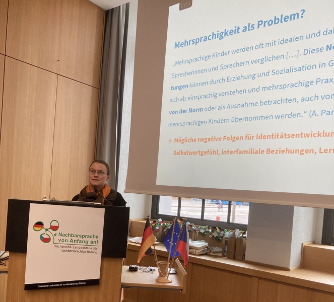 Vom deutsch-tschechischen Geschichtentag in Chemnitz, über den Aktionstag im Rahmen der Anti-Gewaltwochen am Regionalen Beruflichen Bildungszentrum (RBB) in Güstrow bis zum Fachtag „Kinderschutz“ der AWO Rostock im Technologiepark Warnemünde – die Fachstelle Mehrsprachigkeit der RAA M-V war im November viel unterwegs. Anlässe gab es reichlich. In Vorbereitung auf den bundesweiten Vorlesetag, der in diesem Jahr unter dem Motto „Vorlesen spricht deine Sprache“ stand, organisierte die Sächsische Landesstelle für nachbarsprachliche Bildung am 14.11. in Chemnitz, der Europäischen Kulturhauptstadt 2025, einen Geschichtentag und eine Fortbildung für deutsche und tschechische Kita-Fachkräfte, Studierende und weitere Interessierte zum Thema des mehrsprachigen Vorlesens und Erzählens. Zum Start in den Tag hielt Dr. Claudia Seele von der RAA M-V einen Vortrag über Gründe und Wege, sprachliche Vielfalt im Kita-Alltag aufzugreifen und zu fördern.