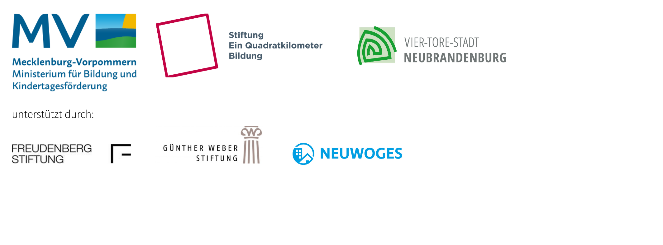Ein Quadratkilometer Bildung Neubrandenburg-Ost ist ein Kooperationsprojekt vom Ministerium für Bildung und Kindertagesförderung M-V, der Vier-Tore-Stadt Neubrandeburg und der Stiftung Ein Quadratkilometer Bildung in Trägerschaft der RAA – Demokratie und Bildung M-V – unterstützt durch die Freudenberg Stiftung, die Günther Weber Stiftung und die Neubrandenburger Wohnungsgesellschaft GmbH – NEUWOGES.